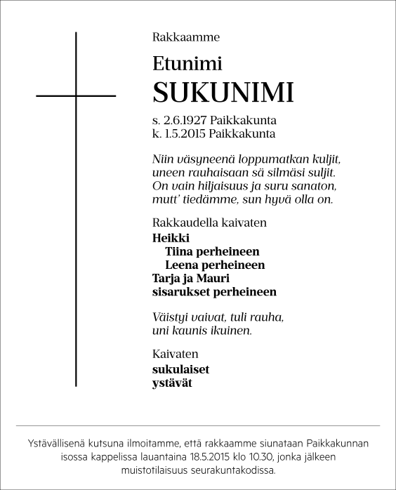 Valitse alla olevista malli-ilmoituksista joko yksi- tai kaksipalstainen. Lopullinen hinta määräytyy ilmoituksen korkeuden mukaan.